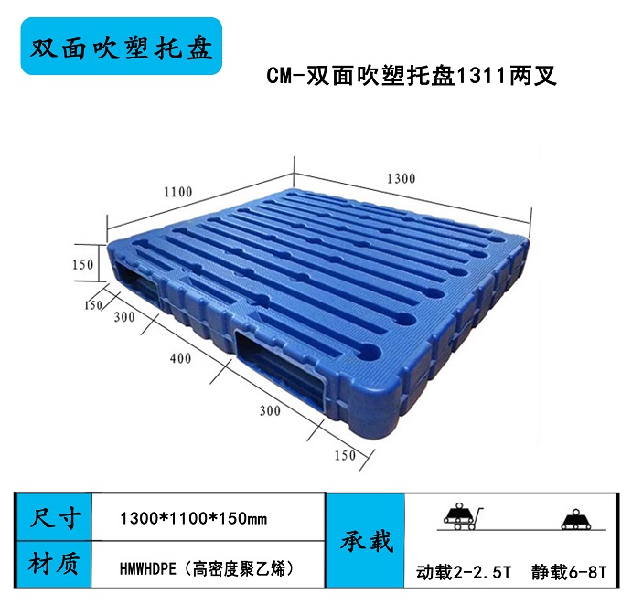 產品描述:1311吹塑托盤,雙面中空塑料托盤1.3*1.1米,石化專用叉車托盤1311